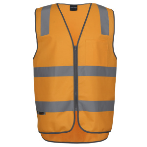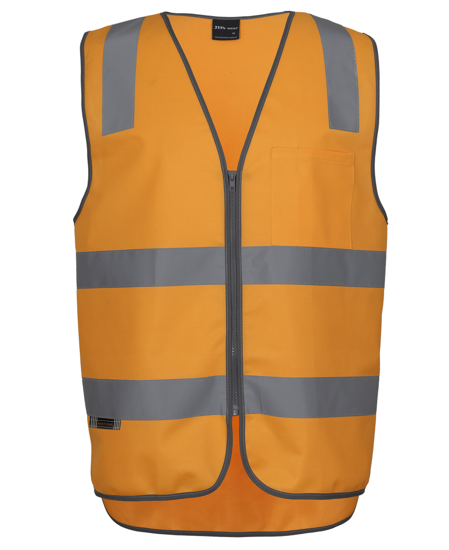 Stay safe and visible with JB’s Aust. Rail (D+N) Zip Safety Vest. Made from durable 100% polyester tricot, this vest features silver reflective tape on AUST. Rail orange fabric. It includes a front zip closure, left chest pocket with pen insert, and grey contrast binding. The drop tail design and compliance with safety standards make it ideal for day and night wear. Available in a range of sizes from 2XS to 5XL.